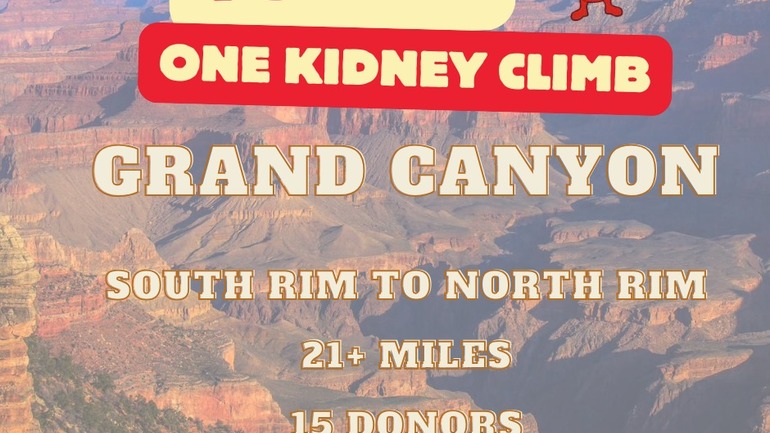 Each year the KDA (Kidney Donor Athletes) group hosts a "one kidney climb" with a limited amount of openings, and USUALLY it's not within the USA. Past trips have been to destinations Kilimanjaro and even Guatemala! For the first year they're hosting the climb, limited to 15 donors, at the GRAND CANYON!